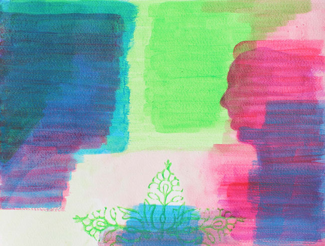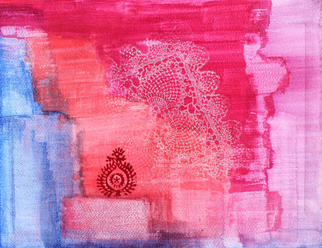 I paint very instinctively. Often, the first mark on the paper comes unconsciously: a rationale takes over slowly as the work develops. There are debates and arguments in mind about why and why not for each  action, selection/ placement of color /image, space division – each move is a like a move on the chess board. A small change in one area has its repercussions on the entire painting. After many a back-and-forth, action comes at the moment when everything looks right, in the right place. And then, suddenly, it gets connected to the thoughts I had pushed into the background.